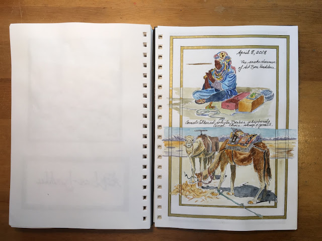 Before going to Morocco I decided that my journal/sketchbook would take the format of a Persian illuminated manuscript. I was also inspired by the artist Delacroix's illustrated 1832 journal when he accompanied a French diplomatic mission to the country. His pages are filled with architectural details, men and women in local dress, landscapes, and color notations. Not having time to sketch during my trip. I created this journal upon my return from Morocco over a period of four weeks using photographs from the trip as inspiration. There was so much more I could have documented, but I believe the pages of this journal reveal the richness of all I saw in Morocco.